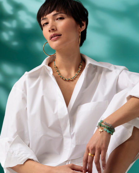 La devise de notre nouveau journal symbolise des looks colorés et frais qui reflètent l’énergie de l’été. Des bijoux en aigue-marine et amazonite associés à des tons dorés chauds et turquoise – des couleurs qui évoquent immédiatement les eaux claires des tropiques et les journées ensoleillées. Le pendentif Birdy, au glamour espiègle, met de bonne humeur.